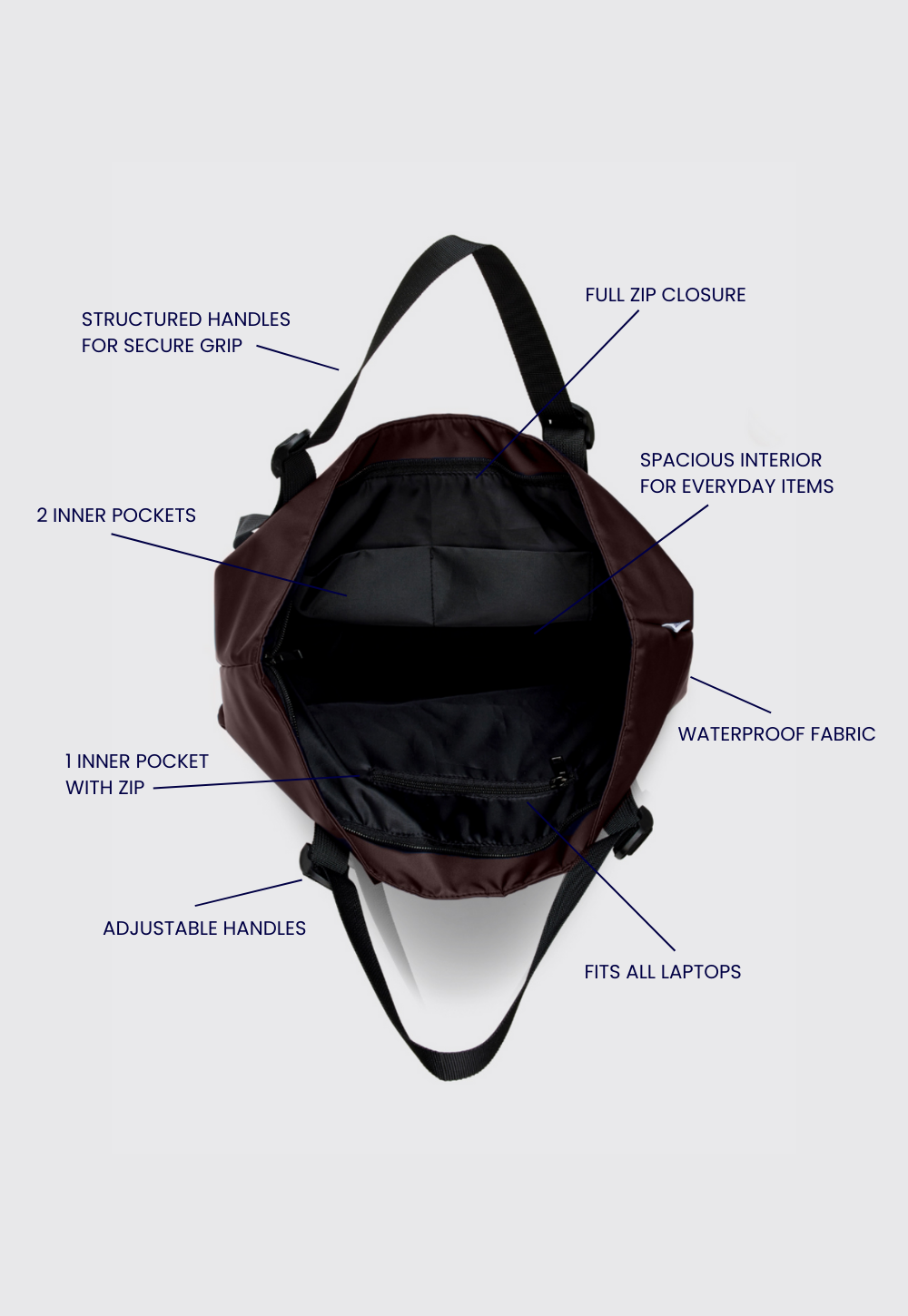 A spacious, waterproof bag with zip closure that can be carried by hand, shoulder, or cross-body.
